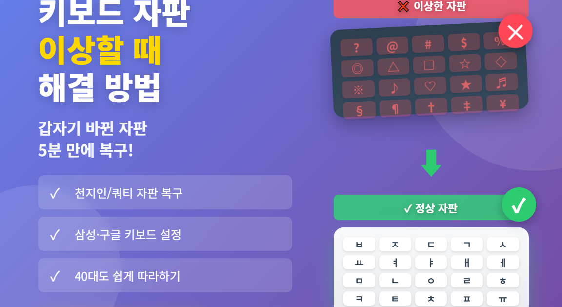 키보드 자판이 바뀌는 증상은 매우 다양합니다. 가장 흔한 증상은 한글 자판 배열이 바뀌는 경우입니다. 평소 천지인 자판을 사용하시던 분들이 갑자기 쿼티 자판(컴퓨터 자판처럼 'ㅂㅈㄷㄱ'가 나열된 형태)으로 바뀌거나, 반대로 쿼티 자판 사용자가 천지인으로 바뀌는 경우가 많습니다. 또한 나랏글 자판이나 단모음 자판 같은 생소한 배열이 갑자기 나타나서 당황하시는 분들도 계십니다.